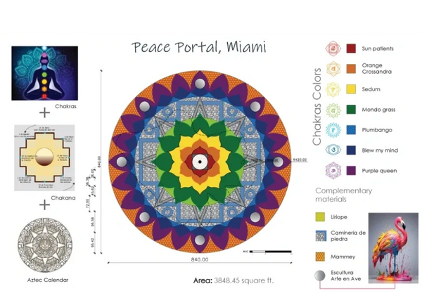 Construcción participativa de un ícono paisajístico simbólico que representa la apropiación e integración intercultural en el espacio público para la promoción de la paz, el amor, la esperanza y la convivencia armoniosa con el medio ambiente, así como entre nosotros. Esto se logrará a través de la creación de un mandala emblemático alrededor de un árbol del parque, jardineras de varios colores que configuran un mandala geométrico, y rodeado de esculturas de flamencos que serán pintados a través de la libre expresión artística de los asistentes al evento Miami Fest-2024.